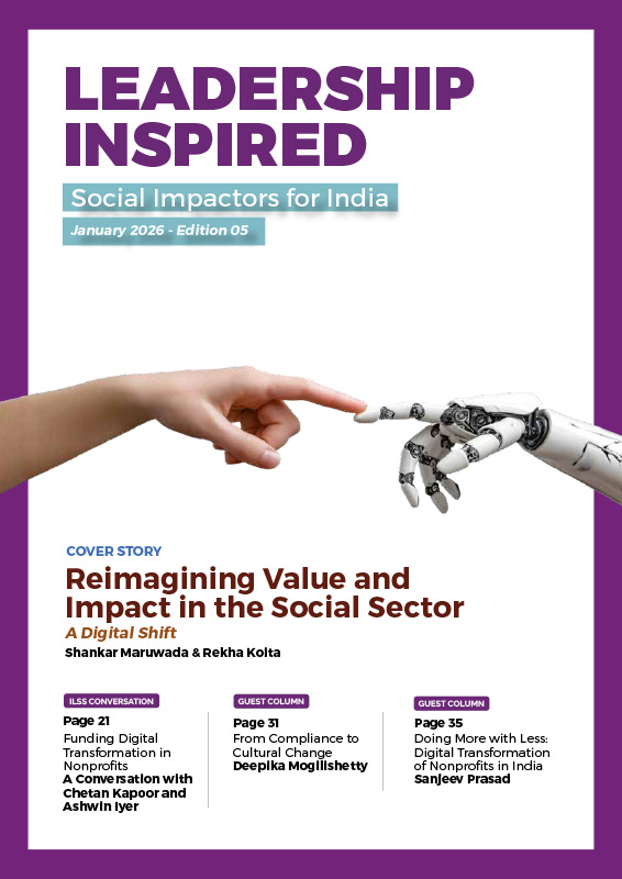 The cover story by Rekha Koita and Shankar Maruwada explores how purpose-led digital transformation helps social organisations reimagine value, redesign systems, and scale impact beyond tools.